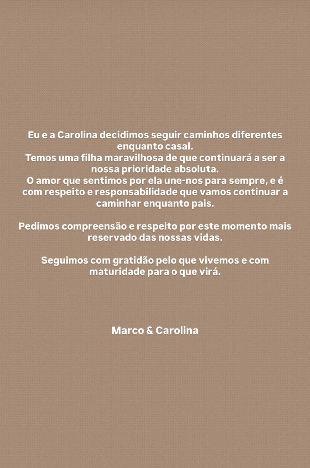 "Eu e a Carolina decidimos seguir caminhos diferentes enquanto casal. Temos uma filha maravilhosa que continuará a ser a nossa prioridade absoluta", começou por escrever nas stories do Instagram o ex - concorrente de reality show.